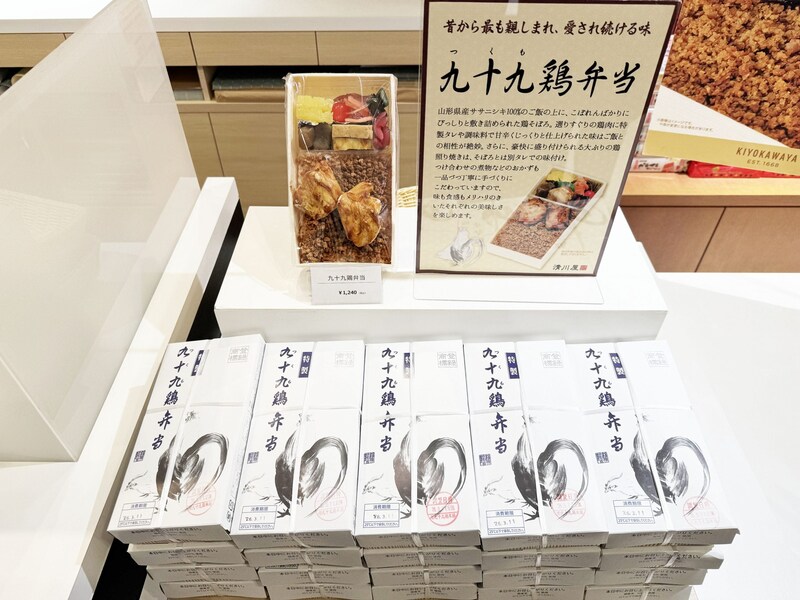 九十九鶏弁当を買うために遠方から訪れる人も多く、売り切れることも多々ある。それゆえ九十九鶏本舗は「九十九鶏漬は売切れの事がありますのでご予約がおすすめです」とアドバイスしている。筆者はJR山形駅のビルにテナントとして入っている、山形の名物品専門店「清川屋」(山形県山形市香澄町1-1-1 エスパル山形2F)で購入した。