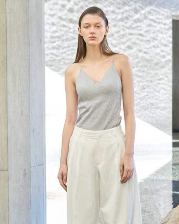 細身ストラップとVネックが抜け感を演出。柔らかなシャーリング風素材で体に心地よくフィットし、シアートップスとのレイヤードにもおすすめ。