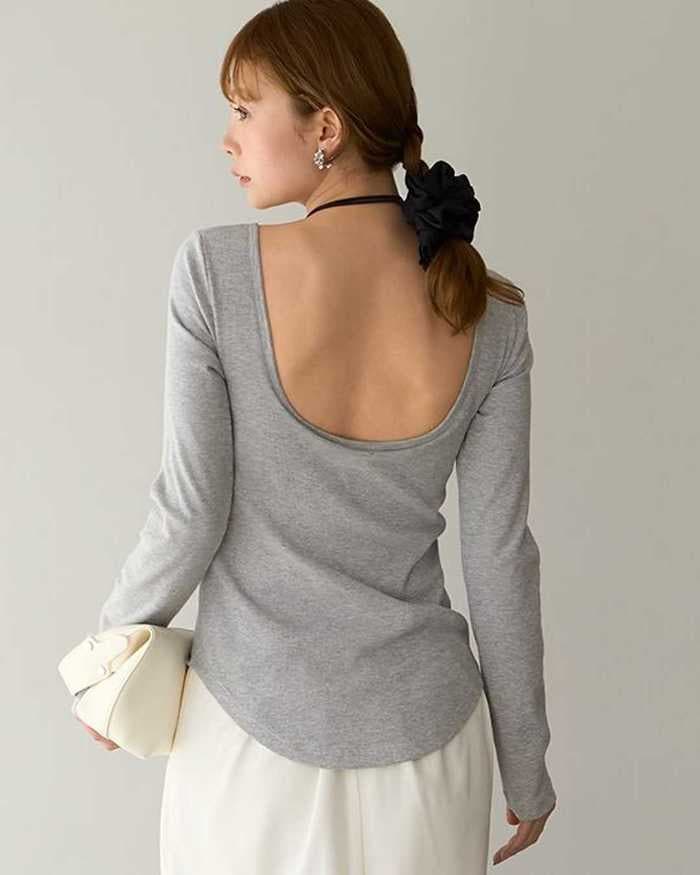 シンプルなフロントと大胆なバックオープンデザインが特徴。背中開きトップスでもインナーを気にせず1枚で着用可能。