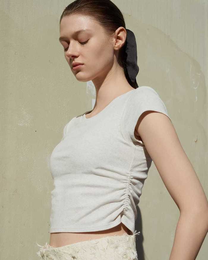 サイドギャザーで立体感を演出。露出を抑えながらスタイルアップできるトレンド感のある一枚。