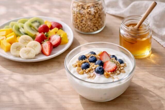 もう一つ見落としやすいのが、ヨーグルトの種類。市販のヨーグルトには砂糖やシロップが加えられている商品も多くあります。フルーツ入りや加糖タイプは食べやすい一方で、糖質量が増えやすい傾向があります。