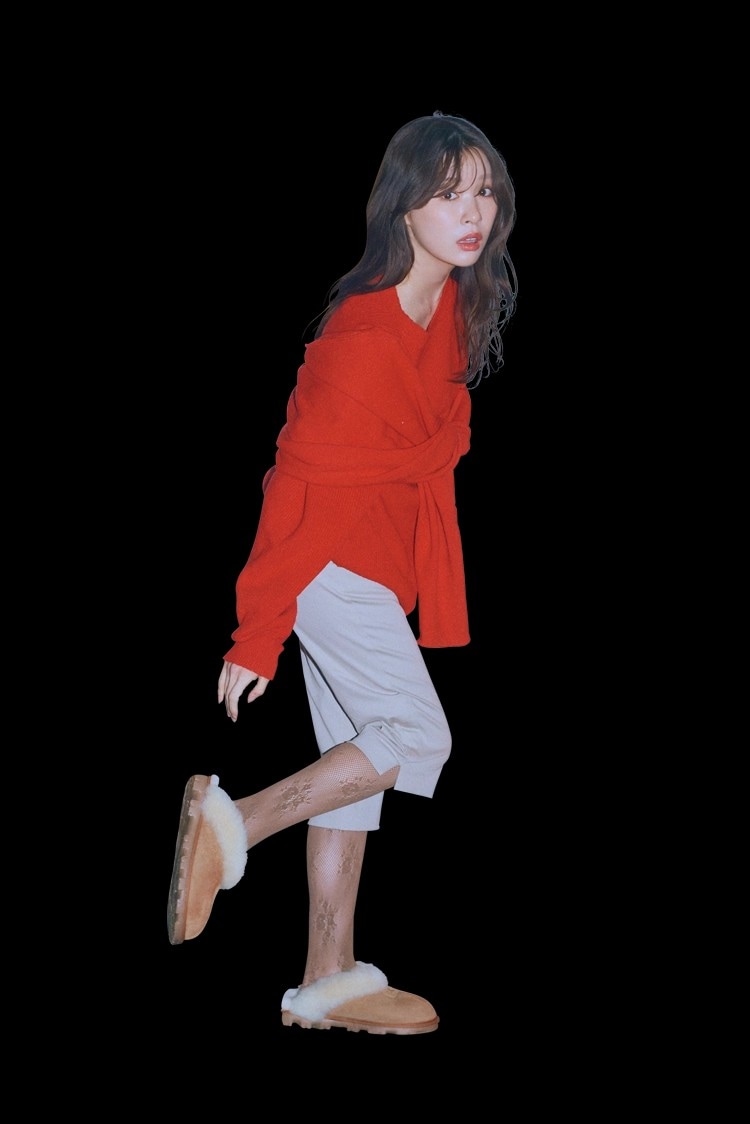 赤ニットトップス 17,930円/SNIDEL ハーフパンツ 11,660円/ASURA(HANA KOREA)レースタイツ 参考商品/MARBLE ムートンサンダル 19,800円/UGG®(デッカーズ ジャパン)