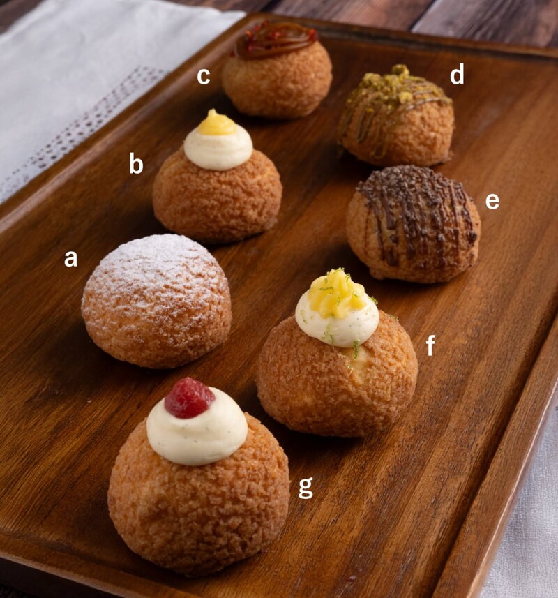 「アトリエ・ディズ」の「シュケット」(5個/1,890円)【3月25日(水)~3月27日(金)販売】a「バニラ」、b「シトロン」、c「キャラメル」、d「ピスタチオ」【3月28日(土)~3月30日(月)販売】a「バニラ」、c「キャラメル」、e「チョコ」、f「パッションフルーツ」、g「フレーズ」