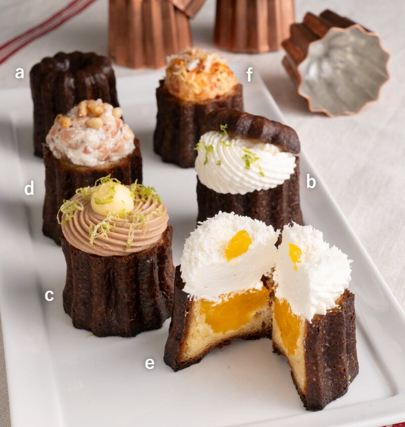 「メゾン・クレムレ」のa「カヌレ(プレーン)」(1個/486円)、b「クレムレ(R)」(648円)【前半のみ販売】c「クレムレ(R)(プラリネシトロン)」(1個/702円)、d「カヌレ・サレ(サーモン)」(1個/918円)【後半のみ販売】e「クレムレ(R)(エキゾチック)」(1個/702円)、f「カヌレ・サレ(パプリカ)」(1個/735円)