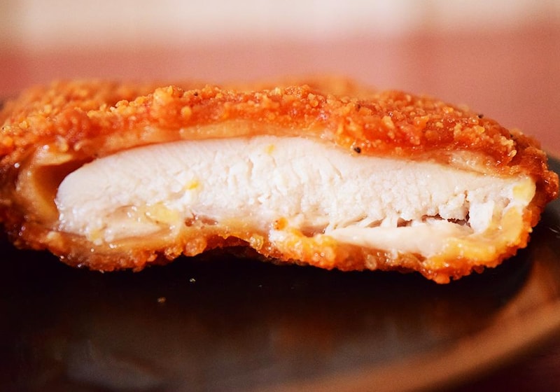 表面はガリッとしたハードめの衣で、全体にやや赤みがかっており、見た目からしてスパイシーさを予感させるパンチのあるビジュアルに仕上がっています。