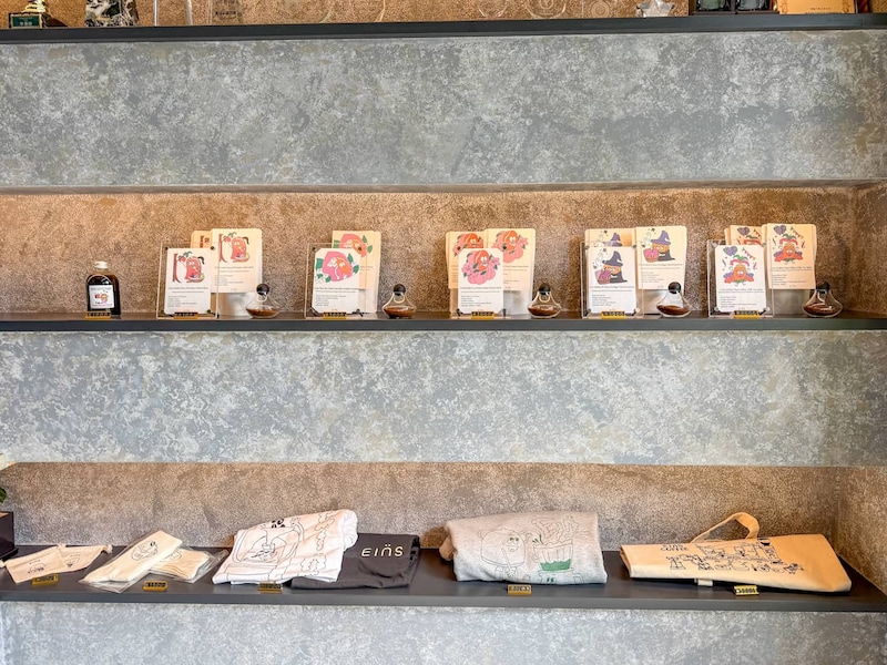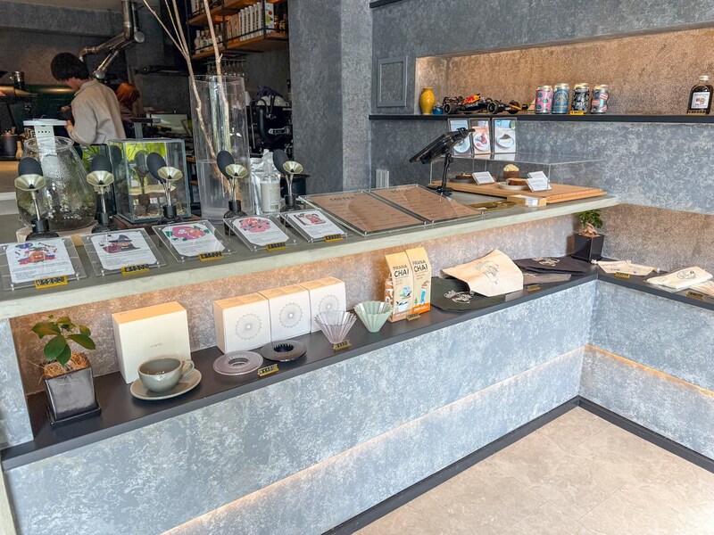 店頭ではコーヒー豆やオリジナルグッズも販売されています。1階にはコーヒー豆の香りを実際に試せるコーナーもあり、初心者でも自分の好みに合った豆を見つけやすいのがうれしいポイント。
