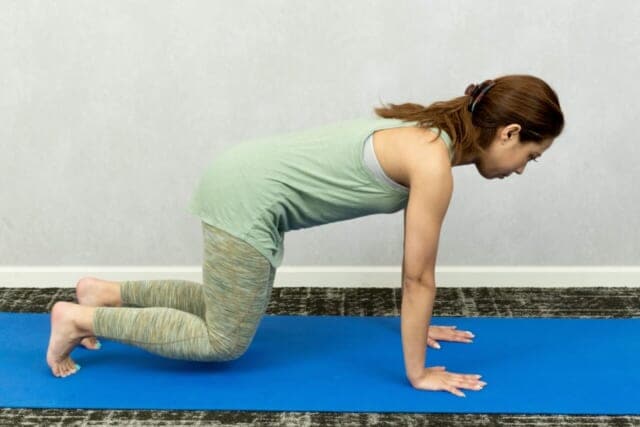 (1)四つん這いになって手のひらを肩の真下に置き、両脚を腰幅に開いてつま先を立てる