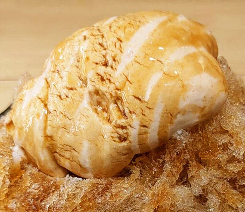 実際に食べるとわかる、その本質。黒蜜ときなこの融合がすこぶるおいしい。間違いない融合の美味しさが極まっている。それを盛り上げるのが氷。天然水を長時間かけて冷やした氷で、さらにそれを、高級かき氷機で削ったそうな。どおりでおいしさが深い。