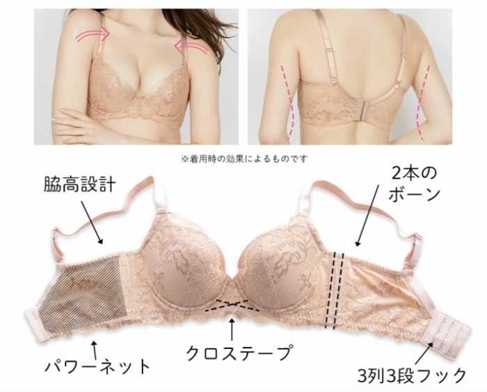 脇高設計と縦横斜めに伸びるパワーネットが、流れやすい脇や背中のお肉を集め、2本のボーンで逃さずキープ。