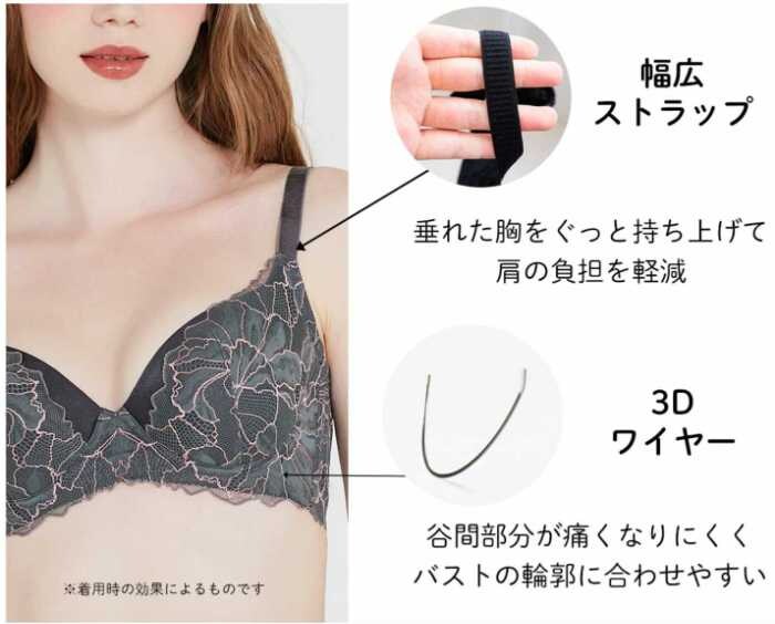 3Dワイヤーと幅広ストラップで優れたフィット感を実現し、谷間部分にワイヤーが当たりにくく痛みを軽減。肩の負担も抑え、長時間の着用も快適です。