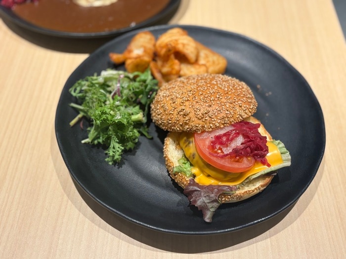 万博会場でも食べた「HASSHOKU醤油糀バーガー」。ボリューム満点のワンプレートになっており、淡路牛と淡路豚のパテを醤油と麹で仕上げた、発酵のコクとジューシーな肉汁が口一杯に広がります。