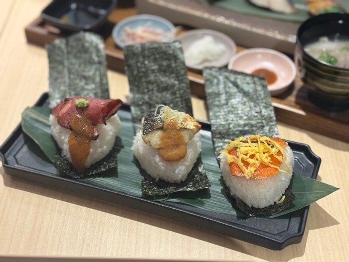 ドドンと大きな具材が乗った「3種の味噌のご馳走おむすび」。和の発酵文化を凝縮、鮭・鯖・ローストビーフの異なる3種類の味わいに、職人仕込みの味噌がアクセントになったおむすび。