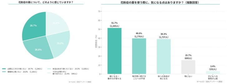 一方で、花粉症対策として一般的に利用される薬に対しては、消極的な姿勢を示す人が多いことも明らかになった。調査によると、花粉症の薬を「積極的に使いたい」と回答した人は27%にとどまり、73%が使用に消極的という結果となった。理由として最も多かったのは「眠くなる・集中力が落ちる」で、唯一過半数の回答を集めた。さらに「毎日使い続けることへの不安」「体への負担が気になる」といった声もそれぞれ約4割にのぼり、できれば薬に頼らず対策したいという本音がうかがえる。