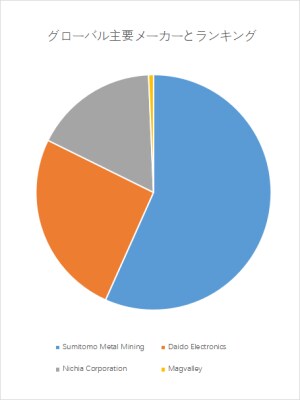 SmFeN系磁石市場は、少数の技術先行企業によって構成される典型的な技術集約型市場である。Sumitomo Metal Miningは原料調達力と磁性材料研究の蓄積を背景に、安定品質のSmFeN粉末供給で存在感を示す。Daido Electronicsは電子部品向け応用に強みを持ち、顧客仕様に応じた材料設計能力で差別化を図る。Nichia Corporationは材料科学分野での基礎研究力を生かし、高付加価値用途向け磁性材料開発を進めている。Magvalleyは新興ながら応用開発志向が強く、特定用途での採用実績を積み上げている。市場シェアは分散しているものの、参入障壁は高く、製造ノウハウと顧客信頼の蓄積が競争優位を決定付ける構造である。