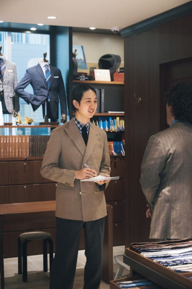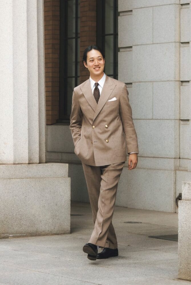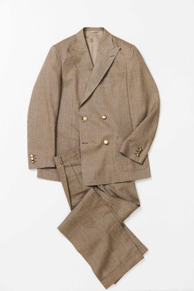ウール55%、リネン45%を混紡したベージュのヘリンボーン生地を採用。コンチネンタルモデルの4つボタンダブルを選び、仕立てはライトコンフォートで軽やかな着心地に。ジャケット6万7650円、パンツ3万8500円(ともにオーダー価格/納期約4週間〜)