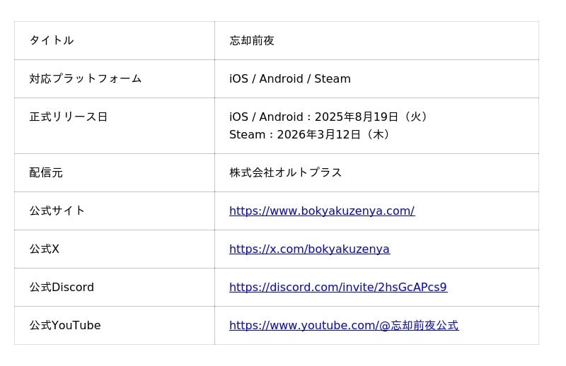 本コラボイベントの開催時期をはじめとする最新情報は、「忘却前夜」の公式Xにてお届けいたします。