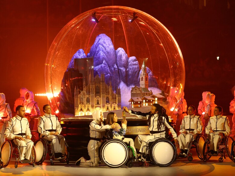 「イタリアのお土産」をイメージさせる演出も随所にちりばめられた。その一つが、旅の思い出を伝える絵はがきだ。ステージに浮かび上がったコルティナの街の絵に、雪の精のようなパフォーマーたちが雪の結晶とともにゆっくりと舞い降りると、「Ciao Ciao Cortina!」との文字が浮き上がり、絵はがきが完成。同時に、いよいよミラノ・コルティナ大会の別れのときが来たことが示され、フラッグハンドオーバーセレモニーへ。2030年の冬季パラリンピック開催国であるフランスにパラリンピック旗が渡された。