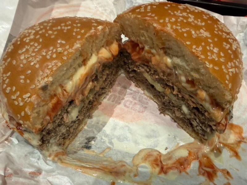 直火焼きのビーフパティ4枚、ゴーダーチーズ4枚、ベーコン4枚というボリューム。総カロリー1713lcal、総重量543gという代物だそうである。