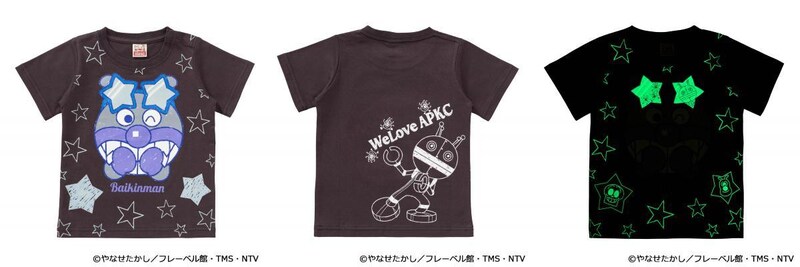 アンパンマン、ばいきんまん、ドキンちゃん、コキンちゃんの顔を大きくプリントした、暗闇で光る半袖のシャツです。