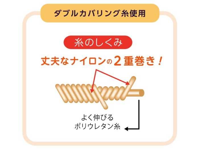 ポリウレタン糸にナイロン糸を2重に巻き付けたダブルカバリング糸を採用し、丈夫で耐久性のある生地に仕上げています。