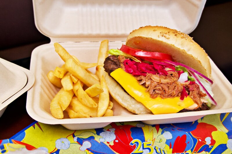 「メルズ・ドライブイン」で販売する「プルドポークバーガー 25周年コースターセット」は、スモーキーなバーベキューソースと、ぎゅぎゅっと詰まったプルドポークが食欲をそそる逸品。「ルイズN.Y.ピザパーラー」で味わえる「ミートボール・ピッツァ 25周年コースターセット」は、肉感たっぷりのミートボールと絶品ソースが相性抜群!
