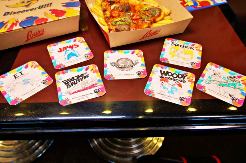「メルズ・ドライブイン」「ルイズN.Y.ピザパーラー」では、「E.T.」や「バック・トゥ・ザ・フューチャー」といった開業当初のアトラクションなどがデザインされたコースターがセットになった25周年記念メニューを販売。カラフルかつちょっとノスタルジックな気分になれるコースターは全7種あり、セットメニュー1つにつきランダムでコースターが1枚配布されます。