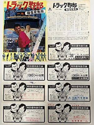 小川 実家がある東京町⽥市に「⼤井スタンプ」という、映画チラシやポスターを売るお店があったんです。店内は映画チラシが入った膨大なクリアブックがずらっと値段別に並んでいましてね。一緒に行った⼩学校のクラスメイトは「ガンダム」や、ちばあきおさんの「キャプテン」といったアニメのチラシを買っていましたが、私のお目当ては勿論、「トラック野郎」の映画チラシ。ここで初めて⼊⼿したのは『男⼀匹桃次郎』だったかな? その後、『天下御免』『度胸』『突撃』『北へ帰る』『熱⾵』『故郷特急便』と買い揃えていくんですが、だいたい1枚50円〜200円くらいで入手できたんです。しかし『御意⾒無⽤』は⾼額チラシとして取り扱われていて、数千円の値がついていたんですよ。今でもそこそこレアで、ヤフオクに出てくると結構な⾦額になりますね。これは流⽯に⼩学⽣の⼩遣いでは買えなくて、⼊⼿したのは⾼校⽣くらいだったかと思います。ポスターやパンフレットよりもチラシの⽅を先に⼿に⼊れたという。