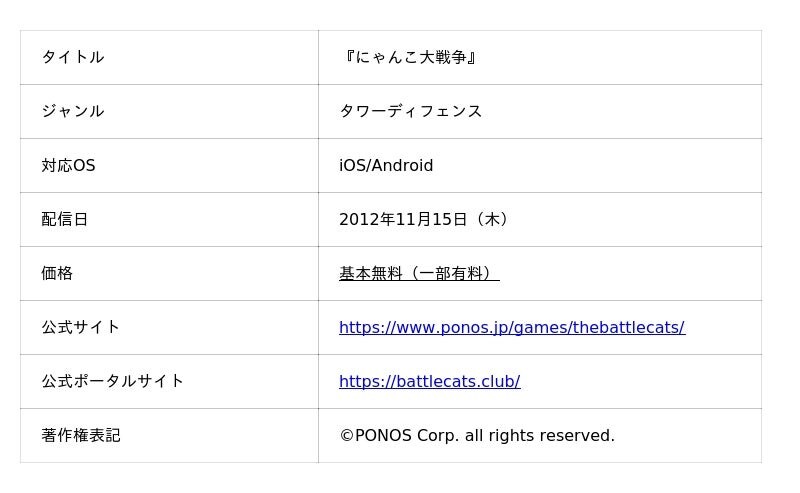 ポノスは、1990年の創業以来一貫してゲームを通してエンターテインメントという文化の発展に貢献してまいりました。【求められるモノは創らない、それ以上を創り出す。】を掲げ、求められるモノの中に、自分たちしか創れない価値をプラスしていくことを私たちは大切にしています。現在は、スマートデバイス向けのオリジナルゲーム開発を核に事業を展開し、代表タイトル『にゃんこ大戦争』は、累計DL数1億1000万回(2025年9月現在)を超え、多くのお客様に楽しんでいただいております。