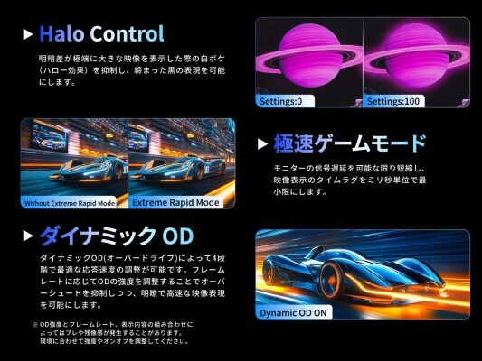独自のDyDs(ダイナミックディスプレイ)TECH 2.0により黒挿入技術とリフレッシュレートを可変制御するAdaptiveSync機能の同時併用を実現。高リフレッシュレート下での残像感を更に低減し、動きの激しい場面でも極めて明瞭な表示を実現します。