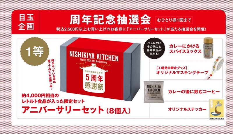にしき食品が展開するレトルト食品専門店「NISHIKIYA KITCHEN(ニシキヤキッチン)」は、2026年3月16日から22日までの期間限定で「ニシキヤキッチン5周年感謝祭」を開催しています。