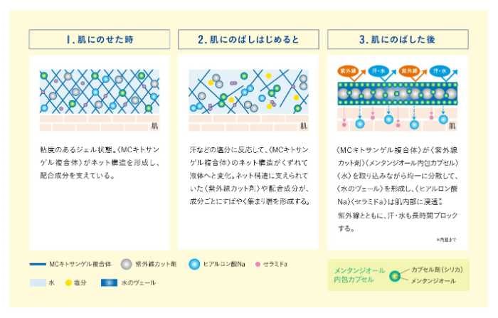 伸びのよいジェルタイプで、白浮きやべたつきが気になりにくく、ひんやりとした使用感が魅力。さらにレモンユーカリの爽やかな香りで、日やけ止め特有のニオイも気になりません。