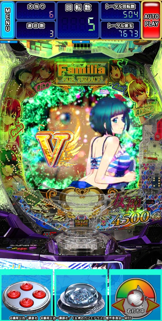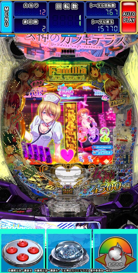 『e女神のカフェテラス』は、2025年7月に施行された新基準「ラッキートリガー3.0プラス」や通常時に超効率的に遊技ができる「BIGスタート」を搭載した業界最先端のスペックとなっており、これを当アプリでも完全再現いたしました。業界最先端のスペックと『女神のカフェテラス』の5人のヒロインが織りなす心揺さ