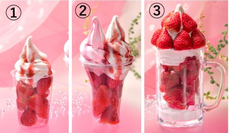「札幌やおきゅう」の(1)「春いちごパフェシングル」(990円)、(2)「春いちごパフェダブル」(1,320円)、(3)「わや盛り春いちごパフェ」(1,980円)※各日販売予定数20