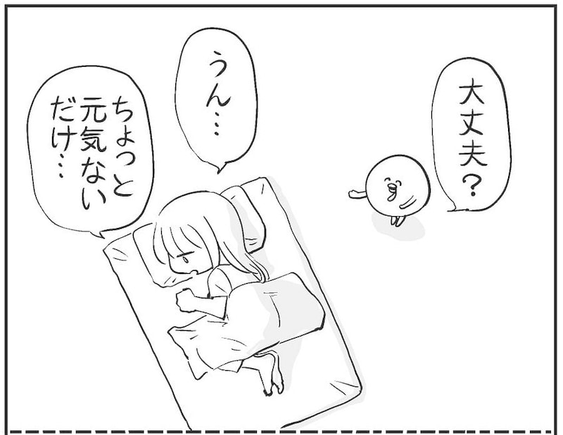日々の生活に追われるOLの女性は元気がなく、布団に横になっていました。彼女に寄り添う不思議な白い生き物は「大丈夫?」と心配そうに見ています。女性が「生活音聞いてるだけで、君がそこにいてくれるって落ち着くから」と言うと……。