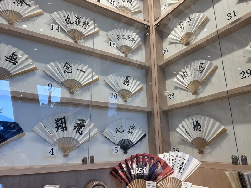 店内には棋士の扇子などが展示されており、将棋の世界観を身近に感じられる空間に。