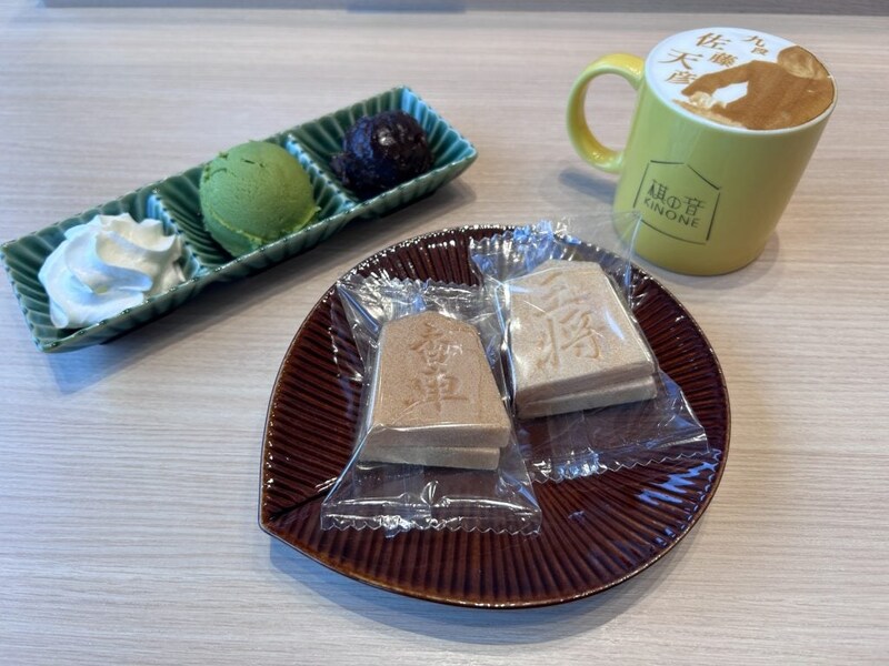 カフェコーナーでカツカレー、棋士ラテ、将棋最中アイスをオーダー。将棋ファンなら気になるメニューです。