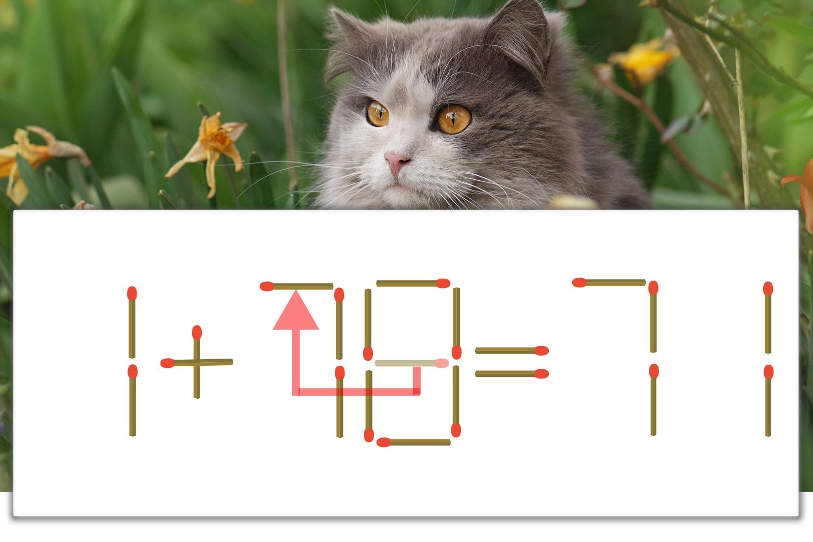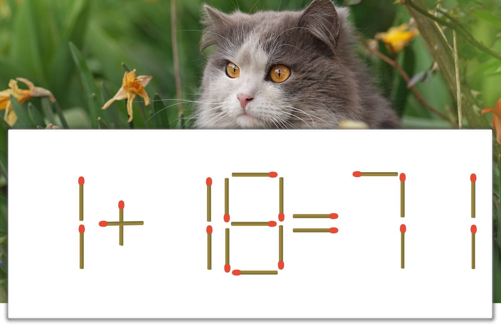 「8」を別の数字に変化させると答えが導き出せます。「8」のマッチ棒を1本移動して、「1」を「7」にしてみましょう。すると、「1+70=71」が成立します。