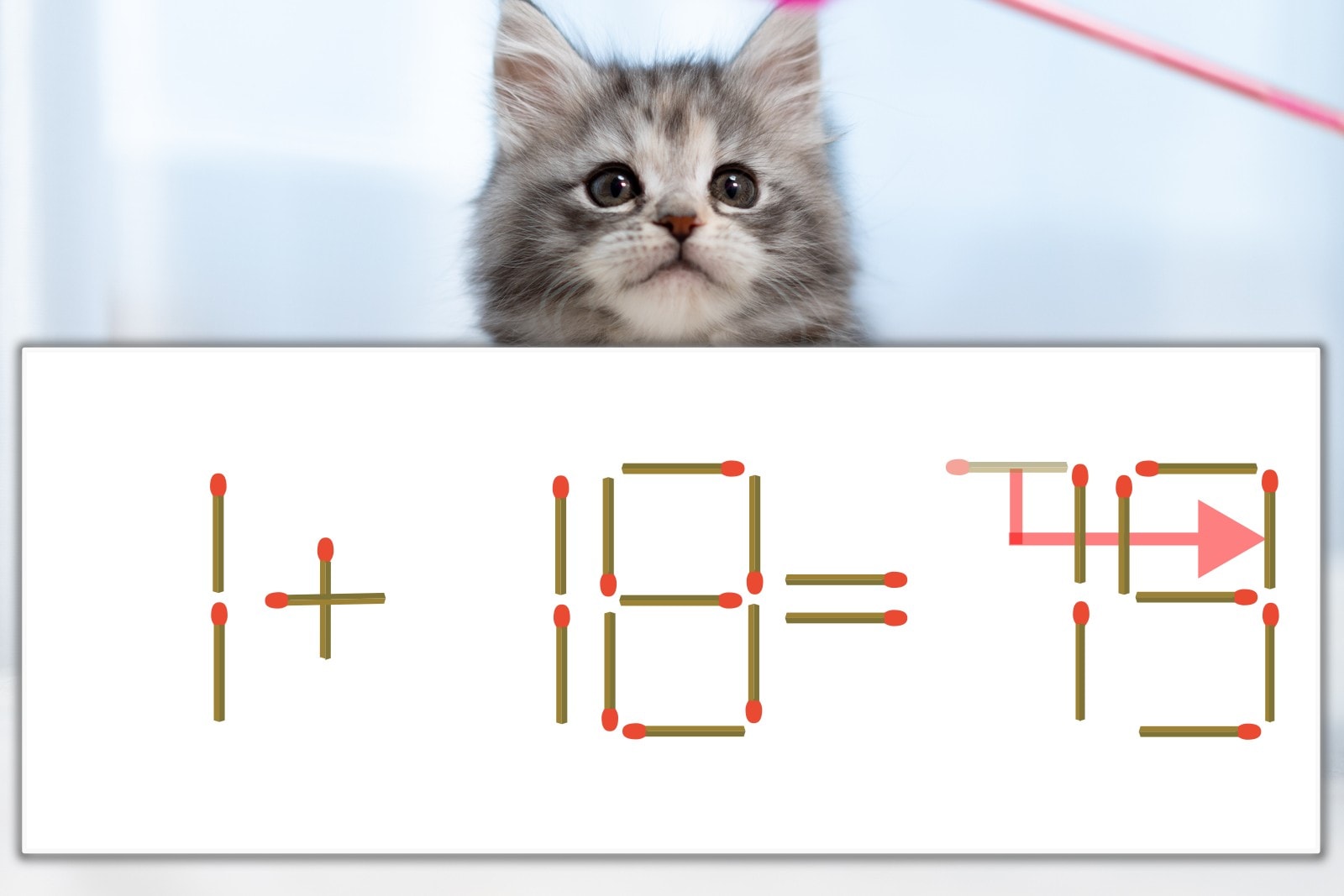 「7」を別の数字に変化させると答えが導き出せます。「7」のマッチ棒を1本移動して、「5」を「9」にしてみましょう。すると、「1+18=19」が成立します。