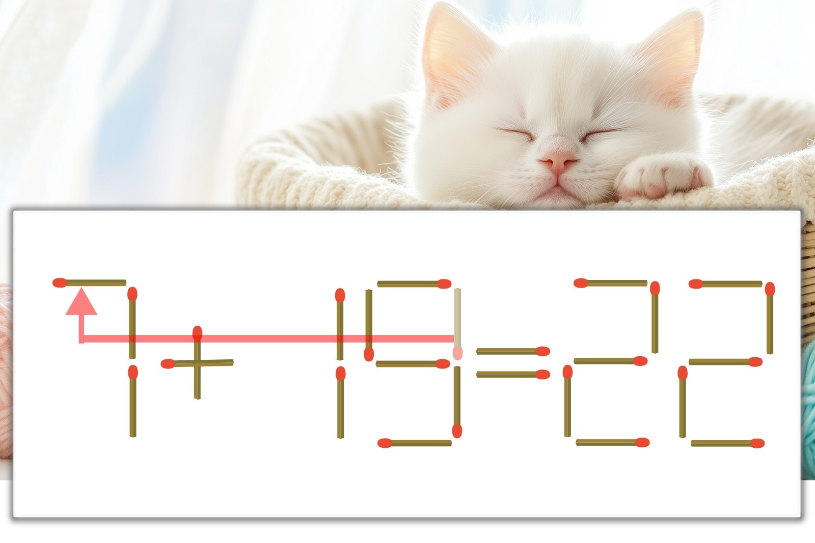 「9」を別の数字に変化させると答えが導き出せます。「9」のマッチ棒を1本移動して、「1」を「7」にしてみましょう。すると、「7+15=22」が成立します。