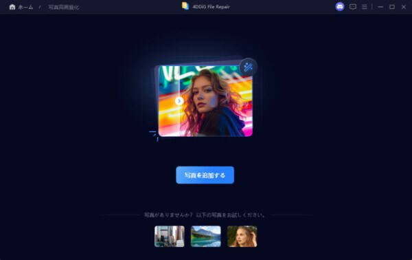 手順1.4DDiG File Repairを起動します。左側のメニューバーの「AI高画質化」タブをクリックします。次に、「写真高画質化」を選択します。