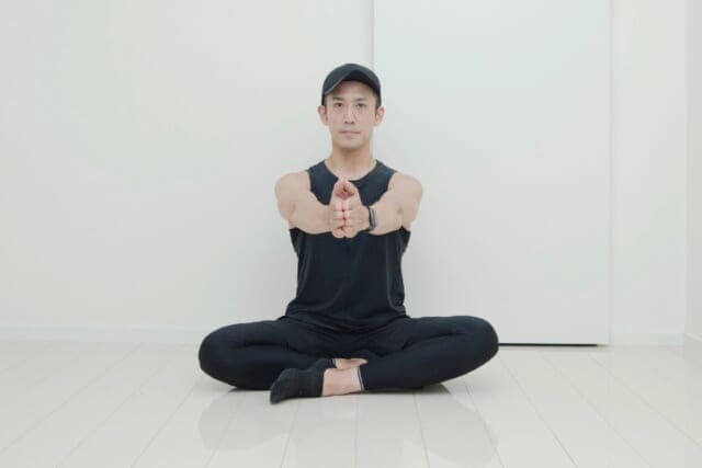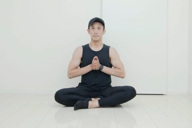 (1)床に座り、あぐら座りして胸の前で両手を合わせる