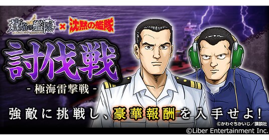 本作のオリジナルシナリオで展開するイベント「討伐戦 -極海雷撃戦-」を開催します。本イベントでは、プレイヤーを待ち受ける敵艦隊を撃破することで、コラボクルー「★6 山中栄治(深海の知恵)」「★5 溝口拓男(深海の眼)」などの報酬が獲得できます。