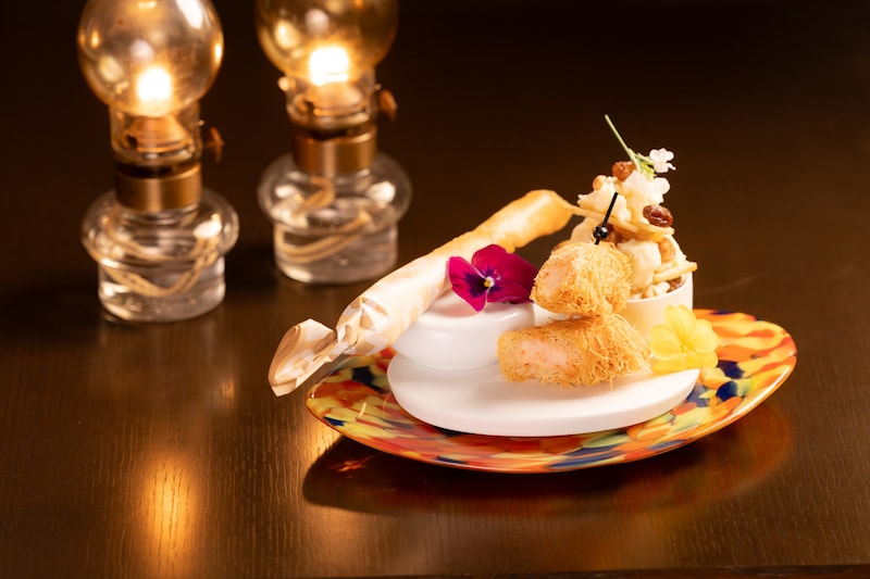 札幌近郊のスキー場やキロロリゾートからもアクセスしやすく、観光地として人気の小樽。大人のアフタースキーの楽しみ方としてもおすすめのスポットだ。会場となるのは、旧小樽商工会議所をリノベーションした「OMOカフェ&バル」。小樽の老舗ブランド「北一硝子」のオイルランプが空間いっぱいに灯され、クラシックなデザインのテーブルクロスやクッションが彩るレトロな空間の中で、揺らめく炎を眺めながら優雅なひとときを過ごすことができる。
