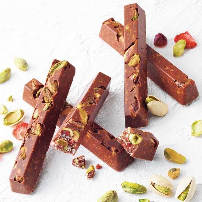 ローストピスタチオを贅沢に使用したチョコレートバー。クランベリーやストロベリーの酸味、クッキークランチの食感がアクセントになり、ひと口ごとに違った美味しさを楽しめます。