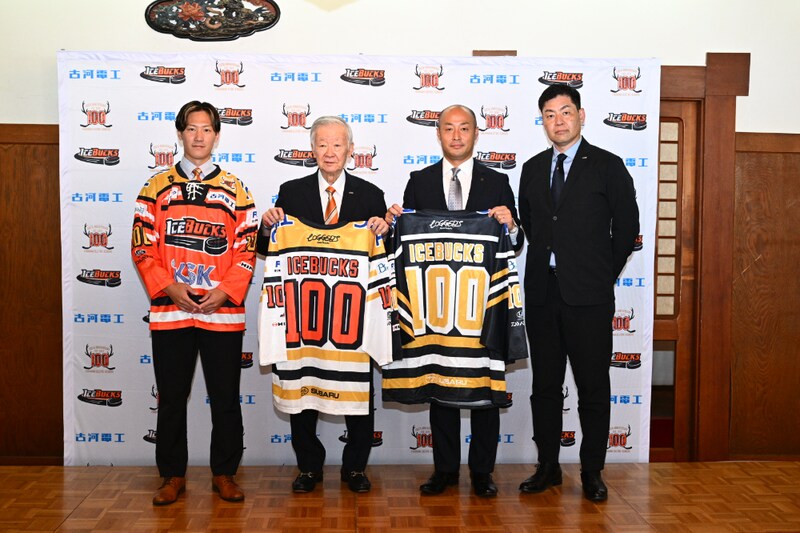 100周年記念の行事に参加したセルジオ越後代表取締役(左から2番目)と、瀬高哲雄日光市長(左から3番目)© ICEBUCKS「日本では、350以上のスポーツチームが廃部になっているのを知っていますか?」