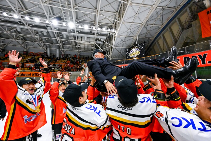 選手に胴上げされるセルジオ越後氏© ICEBUCKSセルジオ越後氏といえば、ブラジル出身の元プロサッカー選手。現役引退後も、辛口の評論でサッカー界ではその名を知らない人はいない人物。それがなぜアイスホッケーチームにかかわることになったのだろうか。