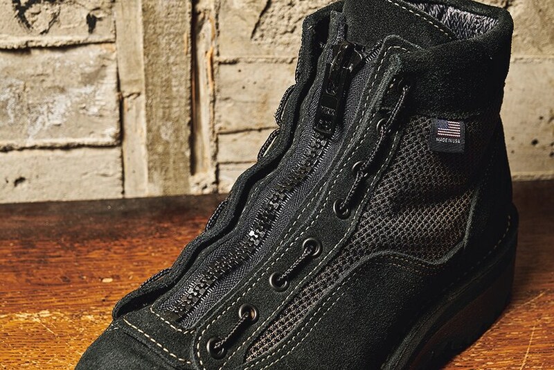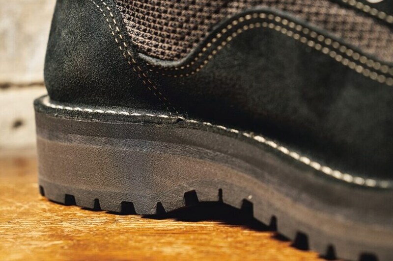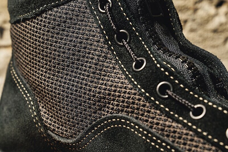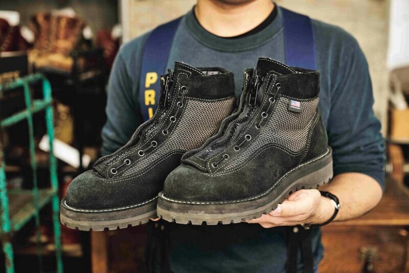 と語るのは、リクラフターとして活躍する名物スタッフのサスペンダー池岡さん。アッパーにはブラックスウェードを採用し、サイドには耐久性に優れたケブラー素材を組み合わせたツートーン仕様のケブラーライト。脱ぎ履きのしやすさを考え、レースインのファスナーユニットを搭載。さらに6㎜のEVAミッドソールを追加し、クッション性と歩きやすさも大きく向上している。