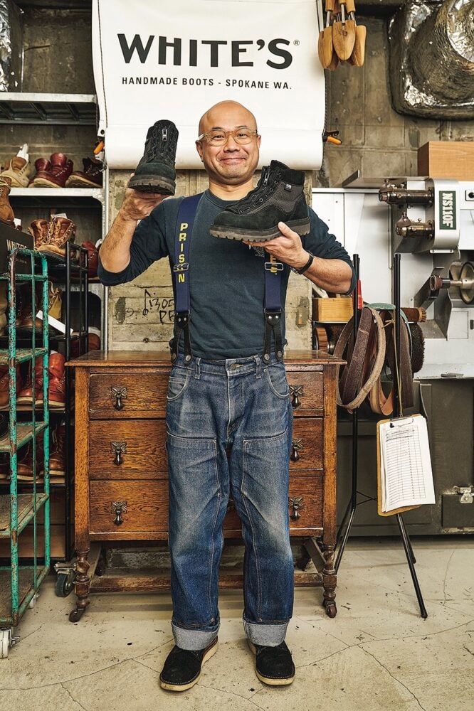 リクラフター・サスペンダー池岡さん|ホワイツブーツの本社工場にて、約7年間、ブーツ作りを学んだ後、スタンプタウン渋谷にて、ホワイツブーツのカスタムオーダーやブーツのリペアを担当する