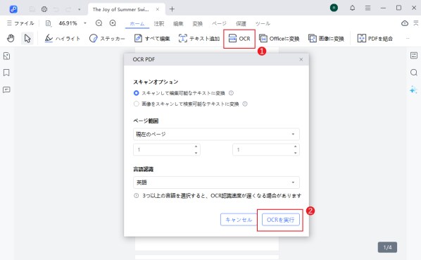 PDFを開くと、自動的にOCRが適用される場合がありますが、手動で実行することも可能です。「ツール」から「スキャンを強化」を選び、「テキストを認識」をクリックします。その後、文書の言語を設定する画面が表示されるので、適切な言語を選択して認識精度を高めます。