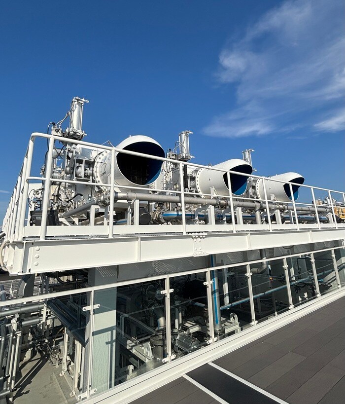 大きな装置からゴーッという音とともに二酸化炭素を回収する様子は、見学者の気分を高揚させます。大阪・関西万博会場の二酸化炭素を、カーボンリサイクルファクトリーの中で、お隣の大阪ガスさんのメタネーション施設にてe-メタンに生まれかわり、会場内の迎賓館などの施設で再利用されています。